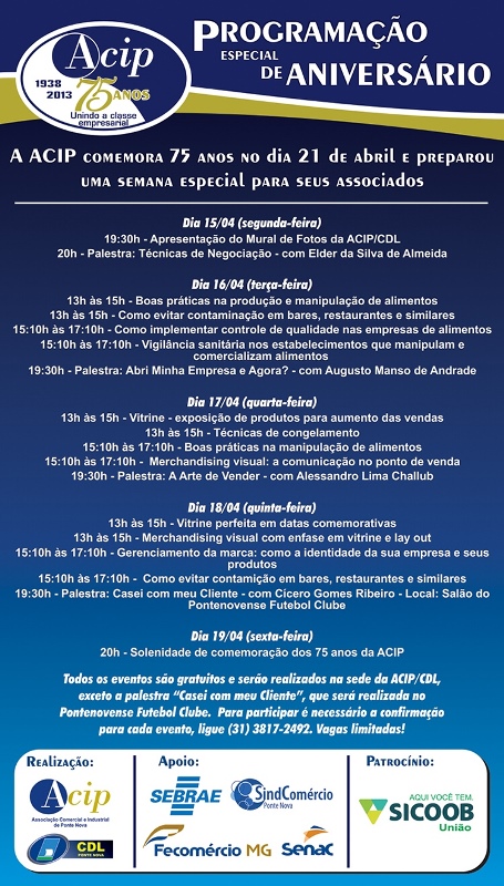 Semana de cursos e oficinas no aniversário da ACIP No dia 21 de abril, a Associação Comercial e Industrial de Ponte Nova (ACIP) completa 75 anos. Para comemorar a data, a entidade planejou uma semana de oficinas, cursos e palestras para seus associados, de 15 a 19 de abril. São dezenas de temas diferentes, para […]