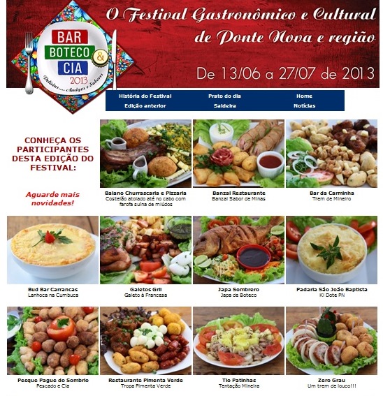 Bar, Boteco & Cia 2013 começa hoje Começa nesta quinta-feira (13/06) a 8ª edição do maior festival gastronômico da região – o Bar, Boteco & Cia 2013. Os 11 estabelecimentos participantes são: Baiano Churrascaria e Pizzaria, Banzai Restaurante, Bar da Carminha, Bud Bar Carrancas, Galetos Grill, Japa Sombrero, Padaria São João Baptista, Pesque Pague do […]