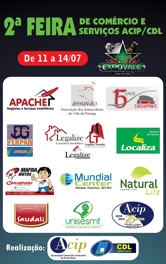 Venha prestigiar a 2ª Feira de Comércio e Serviços ACIP/CDL Começa nesta quinta-feira (11/07) a 2ª Feira de Comércio e Serviços ACIP/CDL, durante a Expovale 2013, no Parque de Exposições de Ponte Nova. Serão vários estandes de empresas associadas, além do espaço da ACIP/CDL. Venha nos prestigiar!