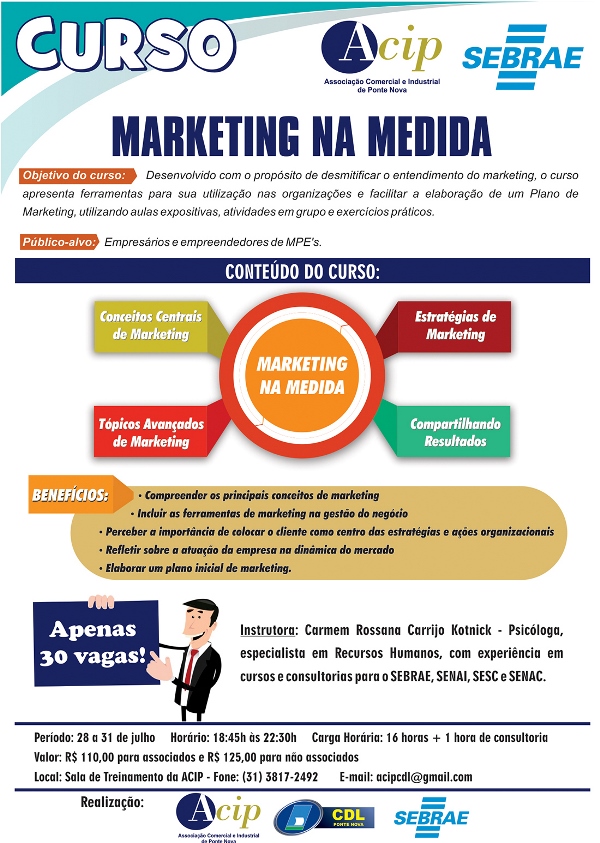 Últimas vagas para o curso “Marketing na Medida” Restam poucas vagas para o curso “Marketing na Medida”, que será realizado em Ponte Nova pela ACIP/CDL e SEBRAE. Além do conhecimento teórico sobre as ferramentas de marketing e como estas estratégias podem beneficiar sua empresa, o curso ainda oferece 1 hora de consultoria para os participantes. […]