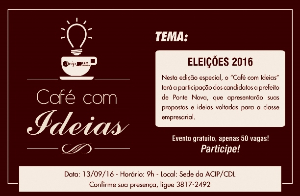 ACIP/CDL irá promover evento com os candidatos a prefeito de Ponte Nova Para que os empresários associados saibam o projeto de governo de cada um dos cinco candidatos a prefeito de Ponte Nova nas Eleições 2016, a ACIP/CDL irá realizar um evento especial. O “Café com Ideias” do dia 13 de setembro será com os […]