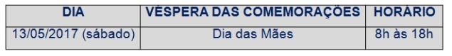 Comércio de Ponte Nova poderá funcionar em horário especial na véspera do Dia das Mães Conforme divulgado pela ACIP/CDL no último mês, o comércio de Ponte Nova está autorizado a funcionar em horário especial no próximo sábado, dia 13 (véspera do Dia das Mães, comemorado no dia 14). A regulamentação aconteceu através de Decreto Municipal.