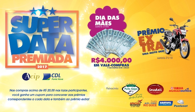 Primeiro sorteio da Super Data 2017 será neste sábado Neste sábado (27/05), a partir das 11h, na Praça de Palmeiras, acontece o primeiro sorteio da campanha Super Data Premiada 2017. O primeiro sorteio é alusivo ao Dia das Mães, comemorado no último dia 14. A premiação será 4 vale-compras de R$ 1.000,00 (mil reais) cada, […]