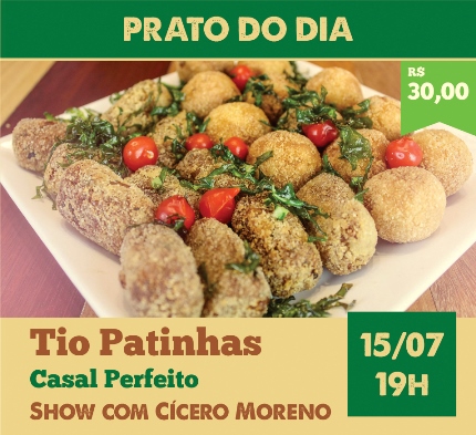Após “Prato do Dia” no Hakuna Batata, sábado é a vez do Tio Patinhas Neste sábado (15/07), o “Prato do Dia” desembarca no Tio Patinhas. A partir das 19h, o estabelecimento servirá o prato “Casal Perfeito”. A noite terá ainda sorteio de brindes de empresas parceiras e show com Cícero Moreno. Venha prestigiar! PRATO DO […]