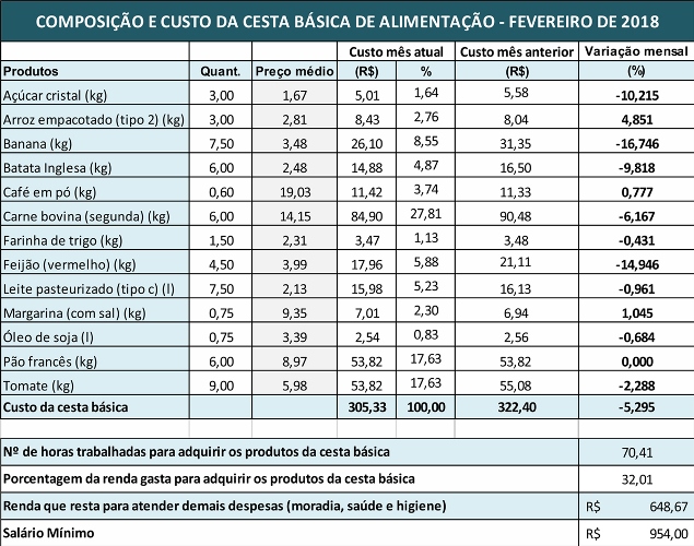 Cesta básica de alimentos de Ponte Nova em fevereiro tem redução de 5,29%