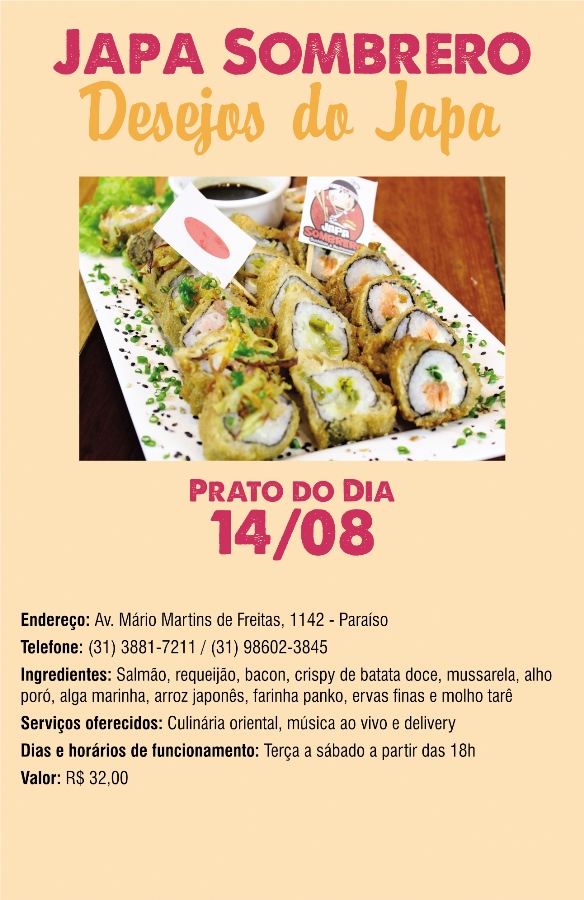 A semana promete! Nesta terça-feira (14/08), o “Prato do Dia” acontece no Japa Sombrero. A partir das 19h, o estabelecimento oferecerá aos clientes o prato “Desejos do Japa”. Veja os detalhes acima. E a noite terá ainda sorteio de brindes de empresas parceiras e show com os músicos Igor Dias e Túlio Calvancanti. Reserve sua […]