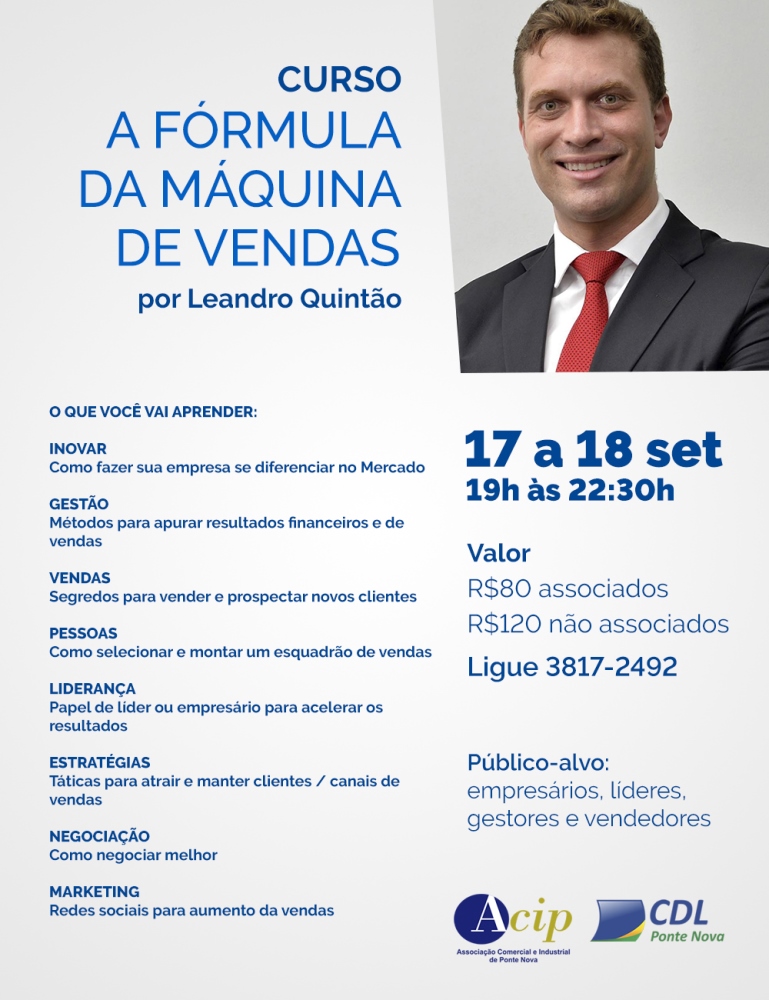 Devido ao sucesso da palestra de Leandro Quintão, realizada em Ponte Nova no mês de agosto, a ACIP/CDL realizará neste mês de setembro um curso com o instrutor. Desta vez, ele terá mais tempo para passar metodologias e técnicas para aumento das vendas. Veja acima todas as informações e não perca essa oportunidade! […]