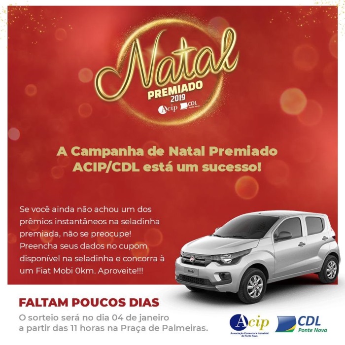 Faltam apenas cinco dias para o fim da campanha Natal Premiado ACIP/CDL 2019. Ainda há seladinhas premiadas para serem entregues aos consumidores, ou seja, as lojas ainda estão entregando os cupons nas vendas a cada R$ 50,00 em compras. As premiações instantâneas variam de R$ 100 a R$ 500 em vale-compras, podendo ser […]