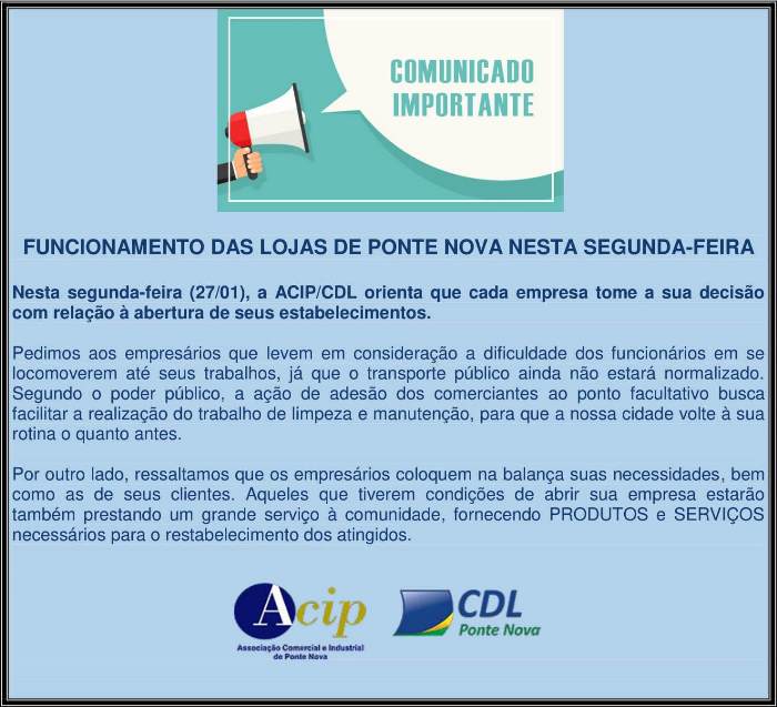 COMUNICADO: Funcionamento das lojas de Ponte Nova nesta segunda-feira