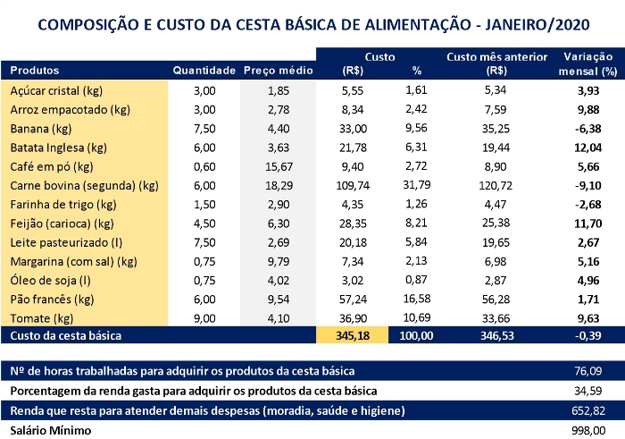 Cesta básica de alimentos com ligeira queda em janeiro/2020 em Ponte Nova