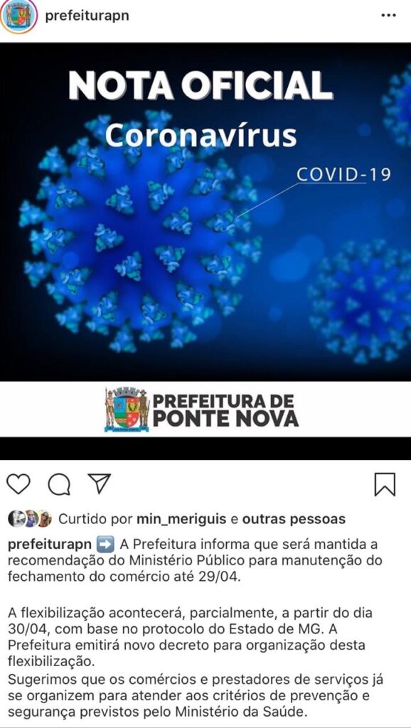 A ACIP/CDL reforça a informação divulgada pela Prefeitura de Ponte Nova na última sexta-feira (24/04). Na ocasião, foi anunciado que o comércio terá sua abertura flexibilizada a partir desta quinta-feira (30/04), conforme a imagem abaixo. Os detalhes ainda serão divulgados pelo Executivo Municipal, através de novo Decreto.
