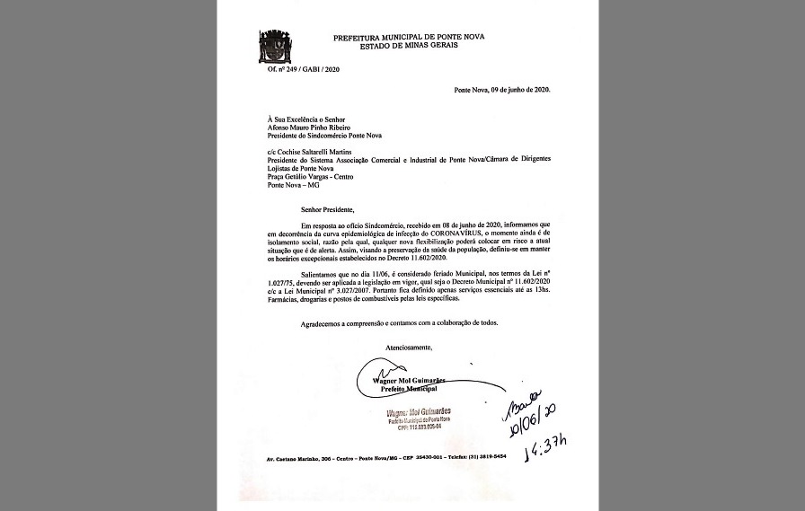 A Prefeitura de Ponte Nova respondeu o ofício do Sindcomércio sobre a possibilidade de ampliação do horário do comércio em Ponte Nova nos próximos dias, em função do feriado de Corpus Christi (11/06) e Dia dos Namorados (12/06). O Executivo Municipal disse não ser possível a mudança em decorrência da curva epidemiológica de infecção do […]