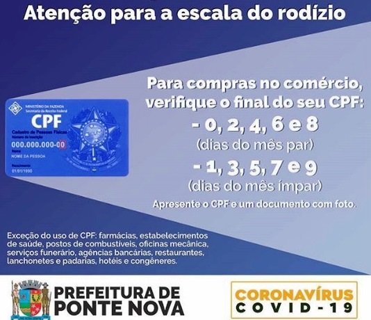 A ACIP/CDL reforça a regulamentação do comércio de Ponte Nova após o Decreto Municipal 11.620, publicado na última sexta-feira (12/06). Desde ontem (22/06), pessoas com o último número do CPF par, só poderão comprar em dias pares. Os cidadãos com CPF terminado em número ímpar só poderão fazer suas compras nos dias ímpares. A arte […]