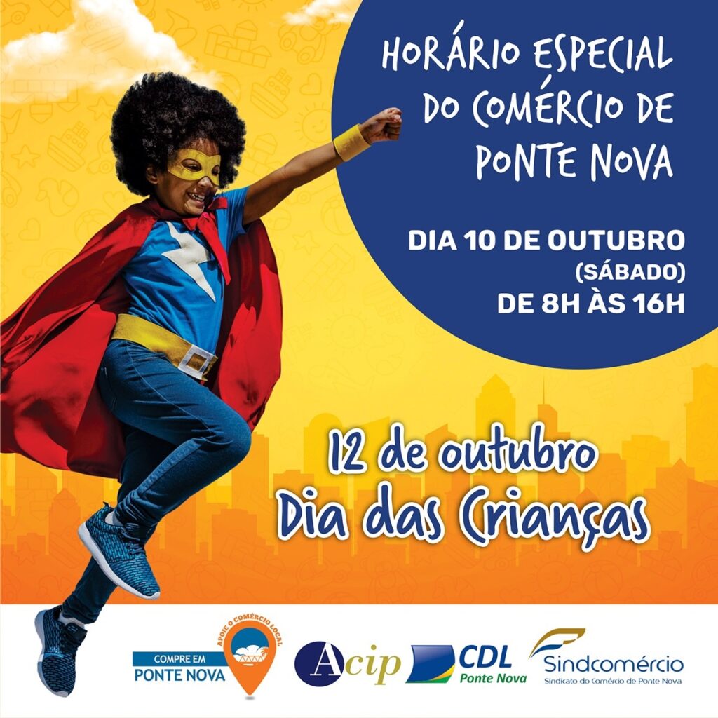Conforme o Decreto Municipal 11713/2020, o comércio de Ponte Nova está autorizado a funcionar em regime especial no dia 10 de outubro, sábado, antecedendo ao Dia das Crianças, que é uma importante data para muitos lojistas. O horário permitido será de 8h às 16h.