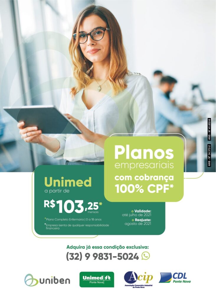 Aproveite os novos planos empresariais da Uniben / Unimed Ponte Nova. Empresário, ofereça este benefício para colaboradores e seus familiares, com responsabilidade total do pagamento pelo próprio funcionário. Para mais informações, ligue ou chame no WhatsApp: (32) 99831-5024.