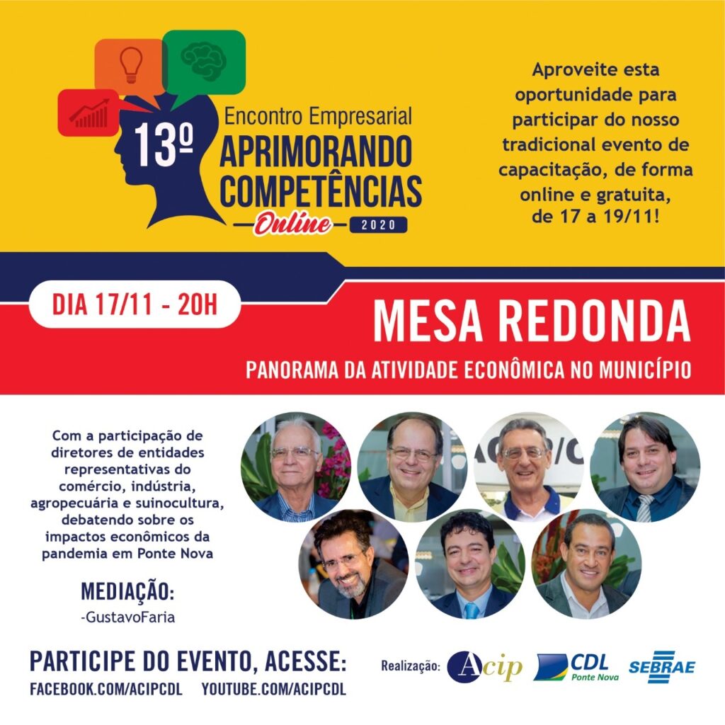 De 17 a 19 de novembro, acontecerá a 13ª edição do Encontro Empresarial Aprimorando Competências, numa realização da ACIP/CDL e do SEBRAE. O evento de abertura acontece nesta terça-feira (17/11), a partir das 20h, em uma Mesa Redonda com o tema: “Panorama da Atividade Econômica em Ponte Nova”. Teremos a participação de diretores e representantes […]