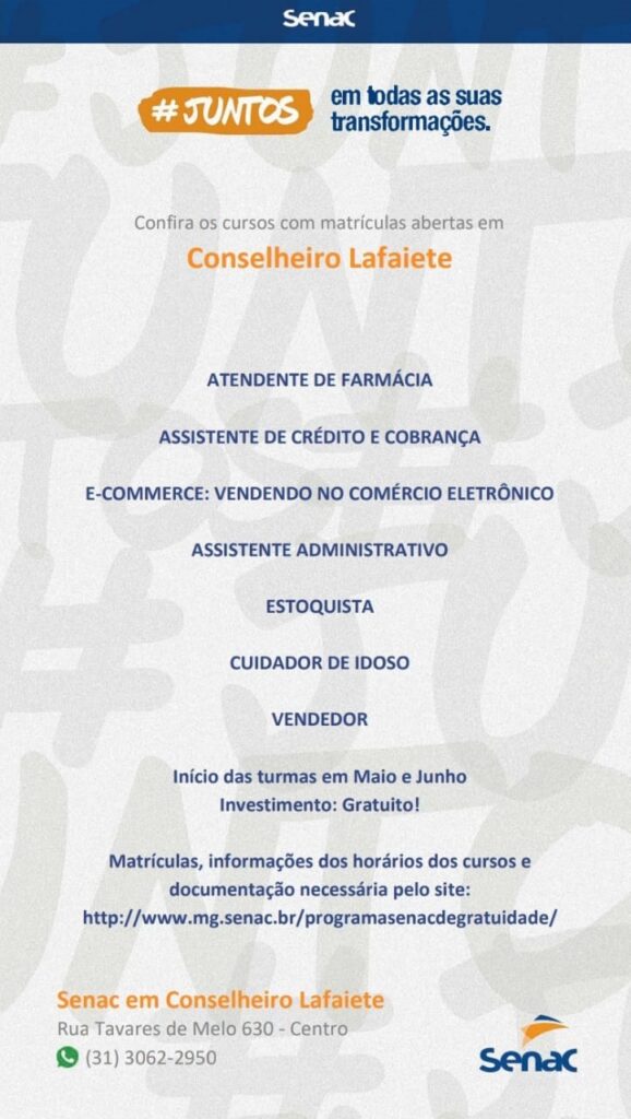O Senac está com matrículas abertas para oito cursos, todos eles GRATUITOS e ONLINE. São eles: Atendente de FarmáciaInício do curso: 17/05/2021Horário: 19:00h as 22:00h Assistente de Crédito e Cobrança Início do curso: 01/06/2021Horário: 13:00h as 17:00h Assistente AdministrativoInício do curso: 07/06/2021Horário: 13:00h as 17:00h E-commerce: Vendendo no Comércio EletrônicoInício do curso: 07/06/2021Horário: 19:00h as […]