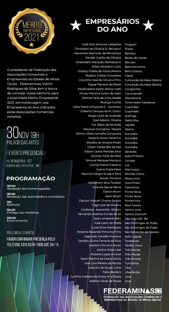 Na próxima quarta-feira (24/11), a ACIP/CDL irá realizar a última reunião ordinária da atual diretoria no ano de 2021. Na pauta deste encontro, está a homenagem aos dois Empresários do Ano de 2021 em Ponte Nova: os irmãos Darlon Brum e Íkaro Brum, da empresa Infornet. Os jovens empreendedores foram eleitos após uma votação dos […]