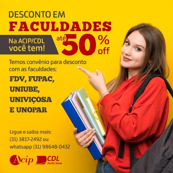 Nunca é demais lembrar: a ACIP/CDL mantém convênio com cinco faculdades de Ponte Nova e Viçosa! São elas: FDV, FUPAC, UNIUBE, UNIVIÇOSA e UNOPAR. São descontos nas mensalidades dos cursos, que podem ser usados por empresários associados e seus colaboradores. O percentual de desconto varia de acordo com a faculdade e com o curso. Para […]