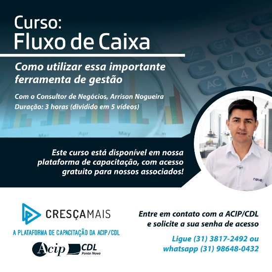 Mais uma oferta imperdível da ACIP/CDL para seus associados: curso sobre Fluxo de Caixa! O treinamento é gratuito e está disponível na plataforma “Cresça Mais”. Para mais informações sobre como acessar, entre em contato conosco pelos números indicados na imagem acima.