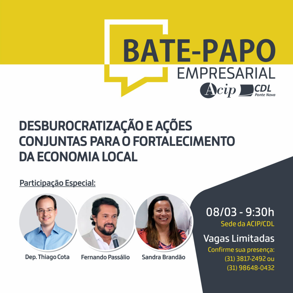 Acontece amanhã, dia 8 de março, o encontro sobre o desenvolvimento econômico regional, que terá a presença de: Thiago Cota (deputado e presidente da Comissão de Desenvolvimento Econômico da ALMG), Fernando Passálio (secretário de Estado de Desenvolvimento Econômico) e Sandra Brandão (secretária municipal de Planejamento e Desenvolvimento Econômico). O objetivo do nosso encontro é […]