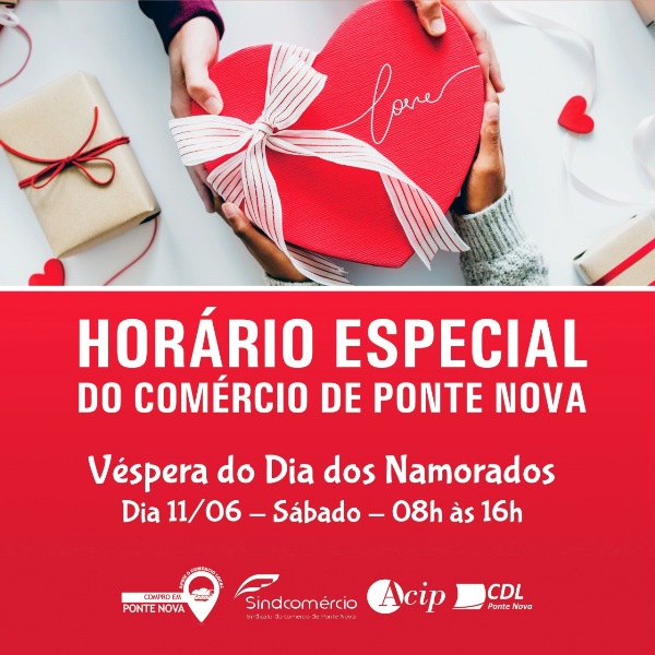 Atenção para o horário especial de funcionamento do comércio de Ponte Nova na véspera do Dia dos Namorados! Priorizem as compras no comércio local!