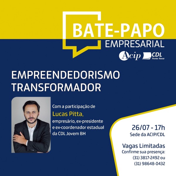 Nesta terça-feira (26/07), a partir das 17h, iremos receber na sede da ACIP/CDL o empresário Lucas Pitta. Ele é ex-presidente e ex-coordenador estadual da CDL Jovem BH. Lucas Pitta irá promover um encontro com empresários da nossa região para falar sobre “Empreendedorismo Transformador”. Ele irá destacar sua experiência nos negócios, trazendo insights e nos impulsionando […]