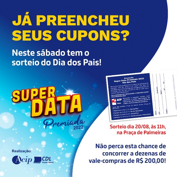 O terceiro sorteio da Super Data Premiada 2022 está chegando! Será neste sábado (20/08), a partir de 11h, na Praça de Palmeiras. Alusivo ao Dia dos Pais, serão sorteados 25 vale-compras de R$ 200 cada. Concorrem ao prêmios os clientes que compraram em uma das lojas participantes da ação e preencheram seus cupons. RECADO PARA […]