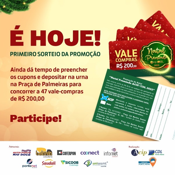 O Natal já passou, mas quem sabe você ainda ganha de presente um vale-compras de R$ 200,00? Preencha seus cupons e boa sorte! Te aguardamos na Praça de Palmeiras, às 19h!