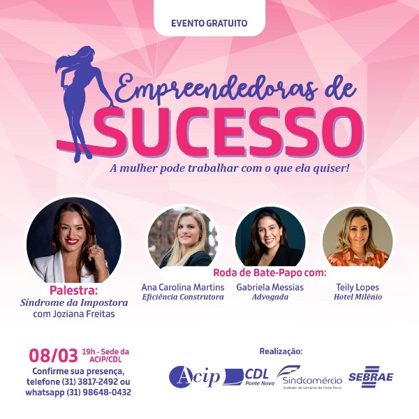 A ACIP/CDL, o Sindcomércio Ponte Nova e o Sebrae se preparam para a realização de mais uma edição do “Empreendedoras de Sucesso”, que acontecerá no Dia Internacional da Mulher (08/03), a partir das 19h, na sede da ACIP. Joziana Freitas irá proferir palestra sobre “Síndrome da Impostora”. A noite terá ainda uma Roda de Bate-Papo […]