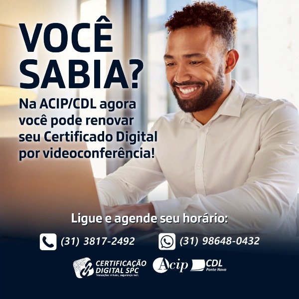 Olha essa novidade! Aqui na ACIP/CDL oferecemos a renovação do Certificado Digital via chamada de vídeo! Mais conforto e agilidade pra você, além de todos os benefícios do produto! Quer saber mais? Entre em contato através de um dos números acima!