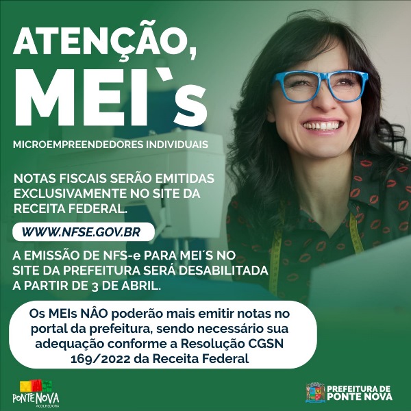 RECADO IMPORTANTE DIVULGADO PELA PREFEITURA DE PONTE NOVA A emissão de Nota Fiscal passará a ser exclusivamente pelo site da Receita Federal, em www.nfse.gov.br, conforme Resolução do Comitê Gestor do Simples Nacional (Resolução n° 169, de 27 de julho de 2022). A partir da próxima segunda-feira (03/04), o sistema de emissão de NFS-e da prefeitura […]