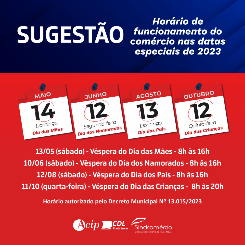 Este é o horário permitido para funcionamento do comércio de Ponte Nova na véspera de quatro datas comemorativas de 2023. A autorização é concedida pela Prefeitura, através de Decreto Municipal. Planeje-se e boas vendas! Horário autorizado pelo Decreto Municipal nº 13.015/2023