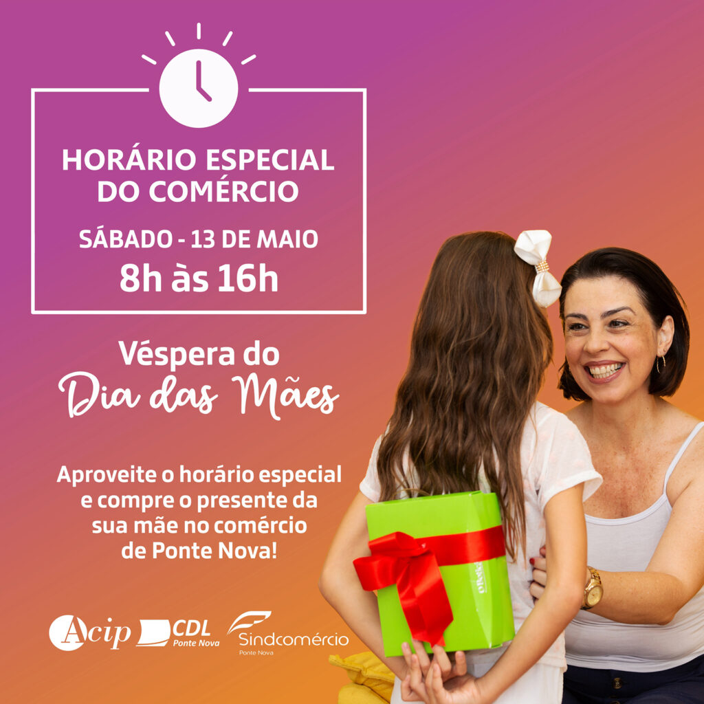 Sua mãe merece aquele presente especial, então aproveite o horário estendido deste sábado (de 8h às 16h) e compre o presente dela no comércio de Ponte Nova! Horário autorizado pelo Decreto Municipal nº 13.015/2023
