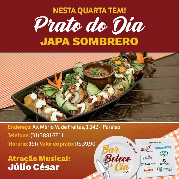 Uma boa dica para curtir hoje a noite de Ponte Nova: experimentar o prato “Mineiridade” do Japa Sombrero! Com direito a show de Júlio César! Partiu?