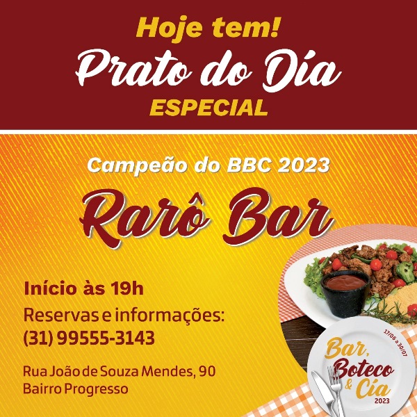 Hoje tem Prato do Dia Especial com o campeão do BBC! A partir das 19h, no Rarô Bar! Venha prestigiar!