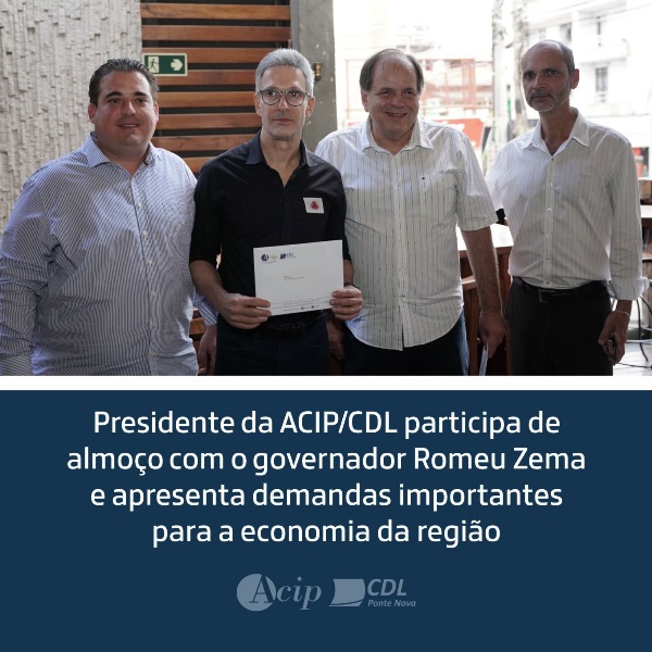 O governador de Minas Gerais, Romeu Zema, esteve em Ponte Nova nesta quinta-feira (17/08). Ele almoçou na cidade com lideranças políticas e empresariais, entre elas o presidente da ACIP/CDL, Antônio Carlos Martins Brandão/Tonca, e o presidente do Sindcomércio Ponte Nova, Afonso Mauro Pinho Ribeiro/Tim. Entre as pautas do encontro, o governador confirmou seu compromisso para […]