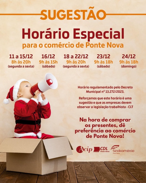 Atenção: sugestão de horário ampliado do comércio de Ponte Nova para as vendas de Natal