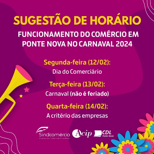 IMPORTANTE: orientações sobre o funcionamento do comércio e demais categorias de Ponte Nova no Carnaval 2024