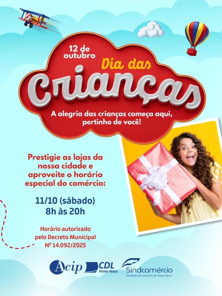 Atenção para o horário especial do comércio de Ponte Nova neste sábado (11/10), véspera do Dia das Crianças. As lojas estão autorizadas a funcionar de 8h às 20h. Nunca é demais lembrar: comprando no comércio local, você mantém o dinheiro circulando na região e fortalece a nossa economia!