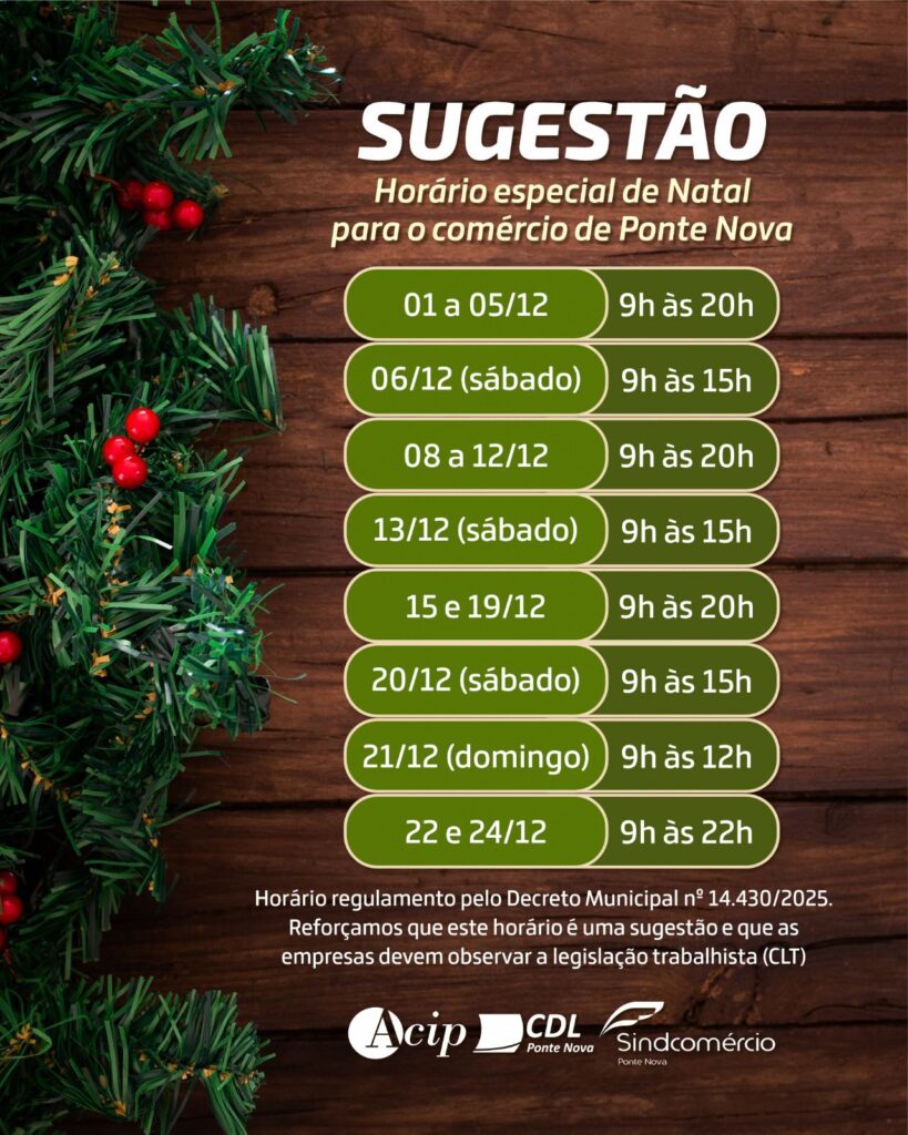 Com a chegada do período natalino, apresentamos uma sugestão de horário especial para o comércio de Ponte Nova,...