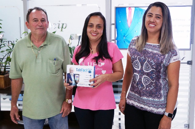 Tablet: José Ildeu (Mobiliadora Santo Antônio), Maria Aparecida Reis Fiorini (ganhadora) e Regislaine
