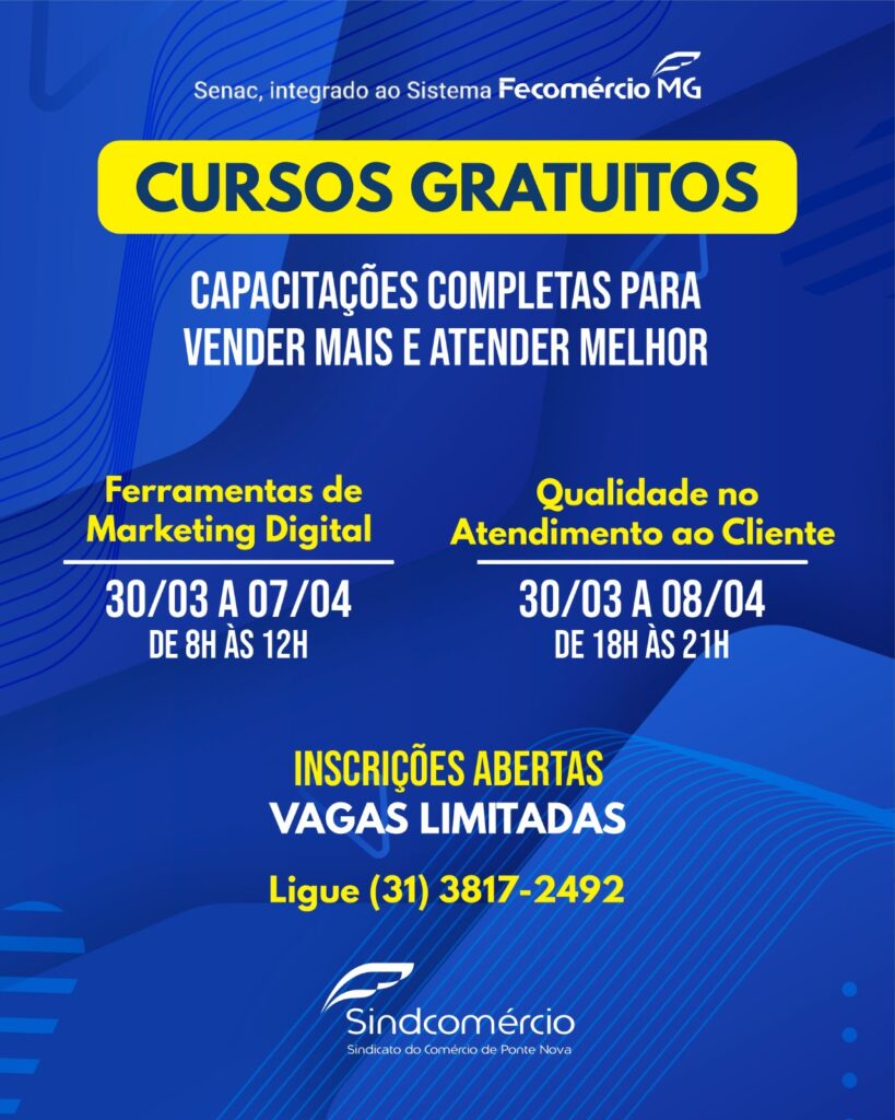 O Sindcomércio Ponte Nova irá realizar dois cursos gratuitos. São eles: